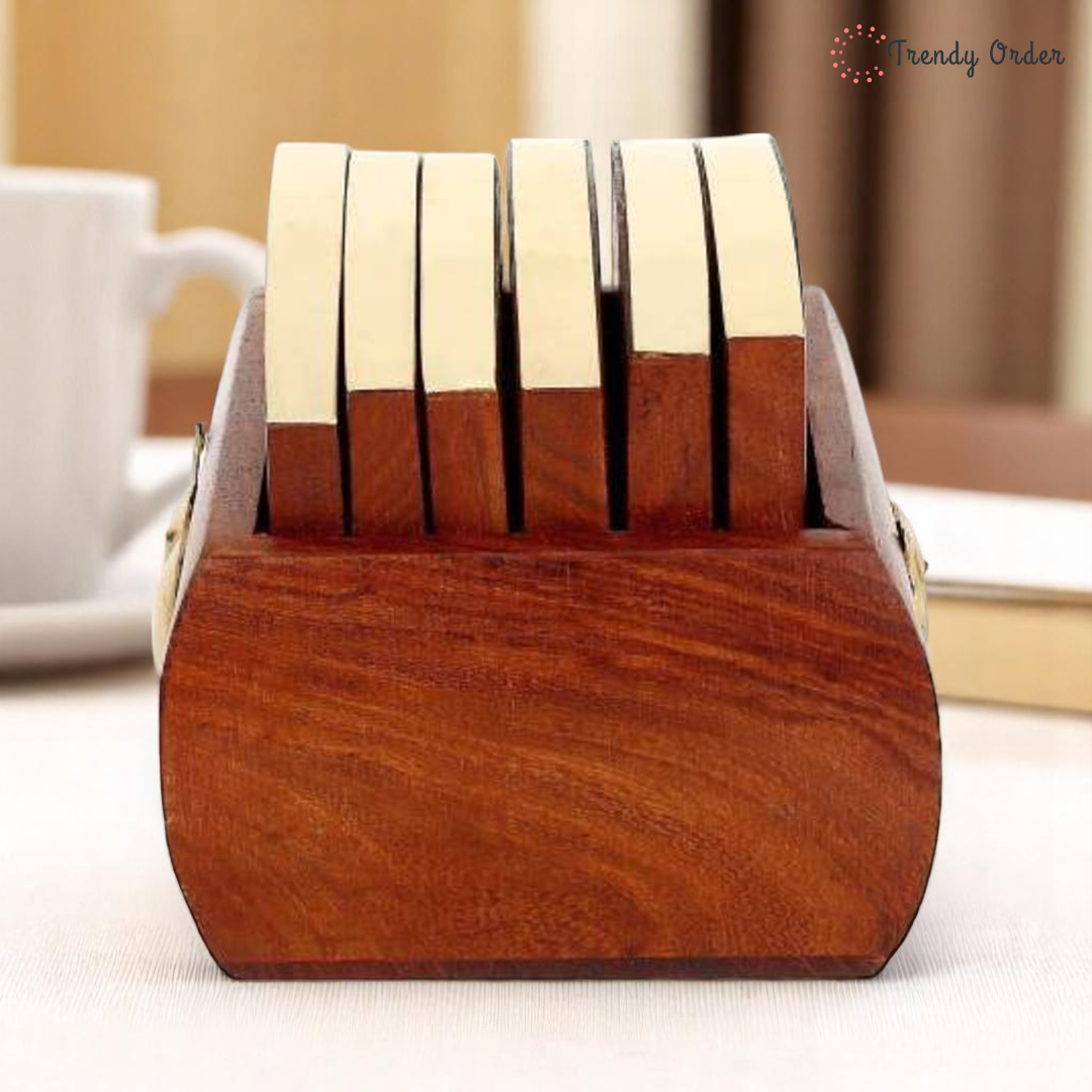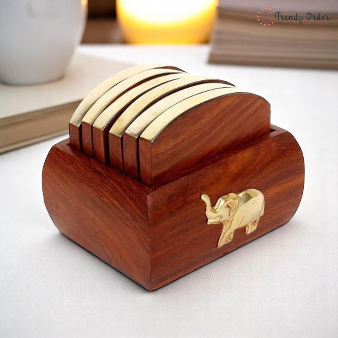 Elevate your coffee table with this distinguished Wooden Coaster Set. Its holder immediately catches the eye, featuring a polished brass elephant motif that adds a touch of royal, ethnic charm to your decor.