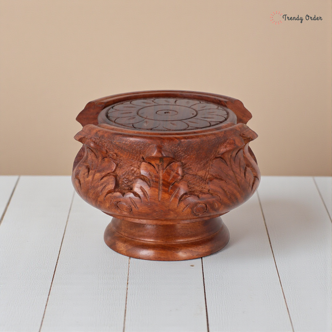 The coasters are stored in an equally impressive pot-shaped holder (or matka). This sturdy holder stands on a pedestal base and is wrapped in a continuous, deep-carved leaf and vine pattern. It’s a substantial, eye-catching piece that doubles as rustic table decor when not in use.