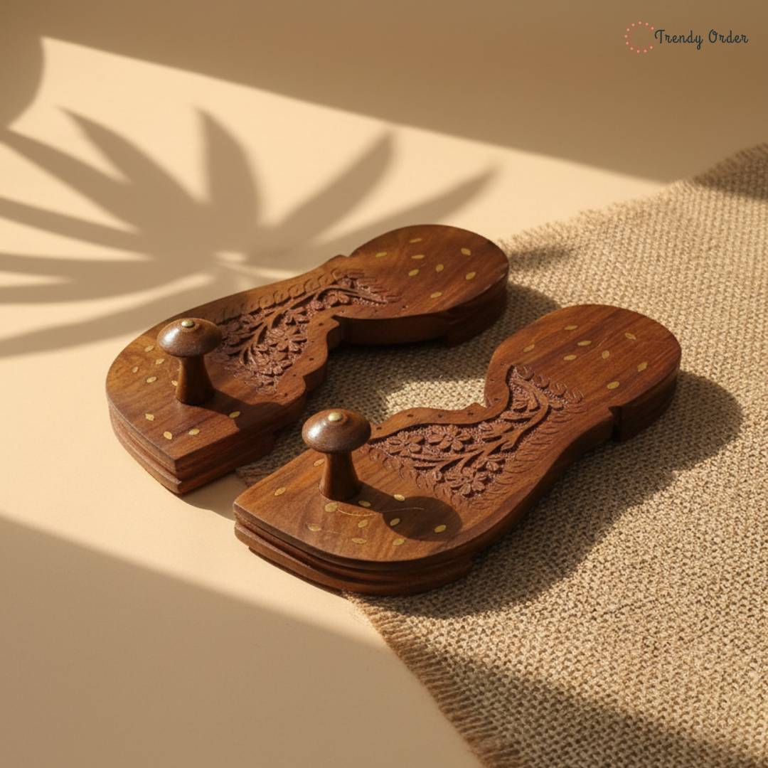 Trendy Order Sheesham Wooden Khadau Chappal Charan Paduka Floral Wooden Paduka