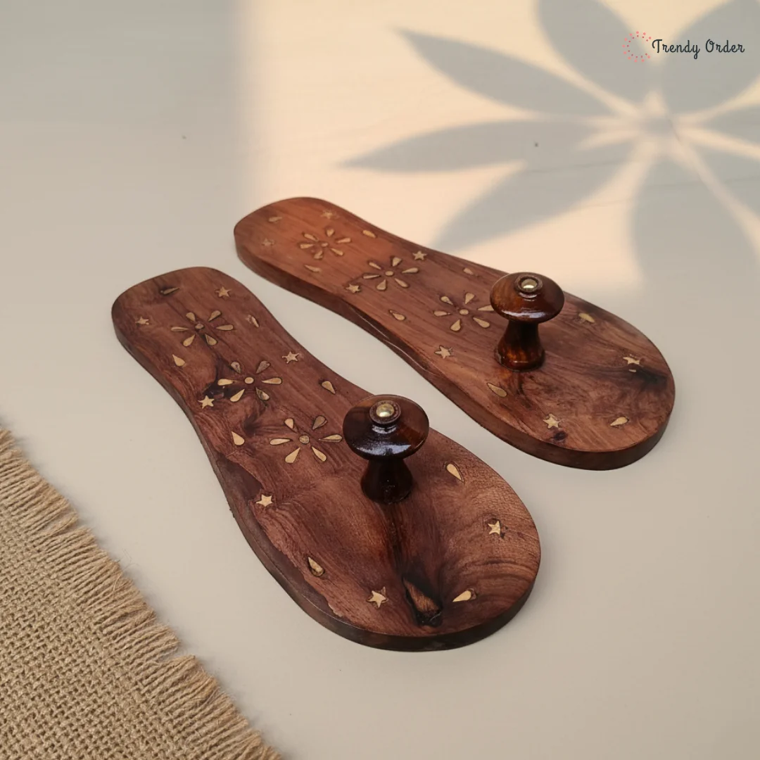 Embrace the rich heritage of Indian craftsmanship and let your feet experience the perfect blend of simplicity and artistry with the Trendy Order Simple Wooden Khadau with Floral Brass Work.