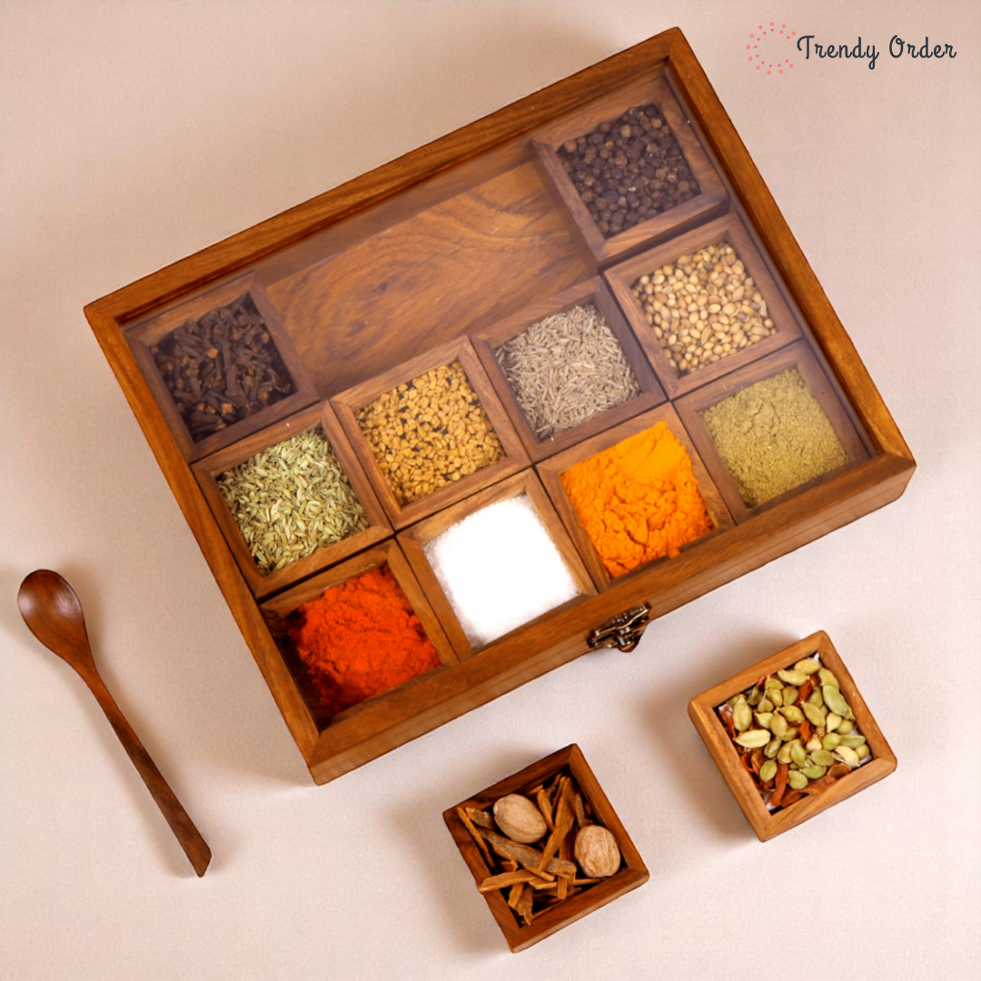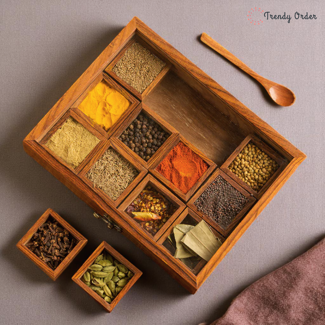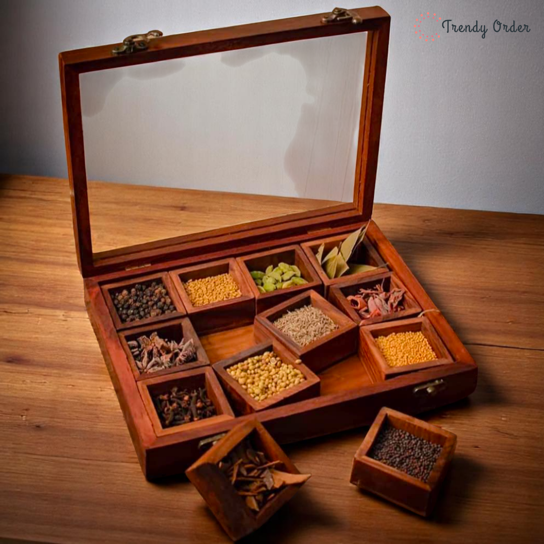 - 12 Removable Bowls: The interior holds 12 individual square wooden katoris. This flexible design allows you to easily remove a single spice for refilling or cleaning, a feature not found in boxes with fixed dividers.